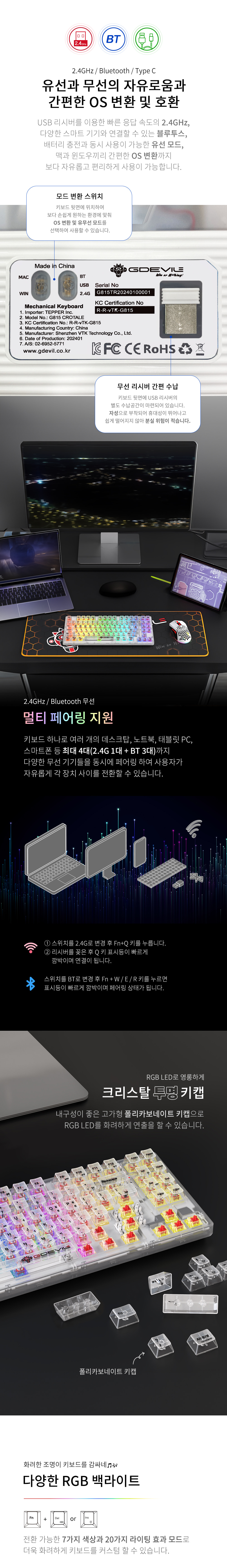 | KC 안전 인증 | [방송통신기자재] 적합등록 대상 품목으로 아래의 국가 통합인증 필함.인증번호 : R-R-vTK-G815인증일자 : 2023-11-24(해당 인증 검사 정보는 판매자가 직접 등록한 것으로 등록 정보에 대한 책임은 판매자에게 있습니다.) |